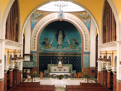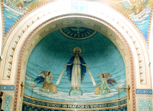 The twelve stars can refer to the Apostles, who represent the entire Church as it surrounds Mary. They also recall the vision of Saint John, writer of the Book of Revelation (12:1), in which "a great sign appeared in heaven, a woman clothed with the sun, and the moon under her feet, and on her head a crown of 12 stars."